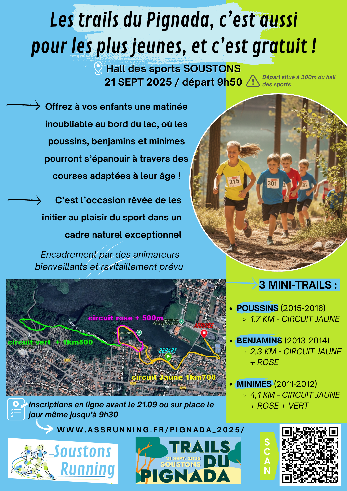 Mini-trail enfants et ados* : départ 9h50 / distances de 4 Km (minimes 2011-2012), 2,5 Km (benjamin.es 2013-2014) et 1,5 Km (poussin.es 2015-2016) / gratuit